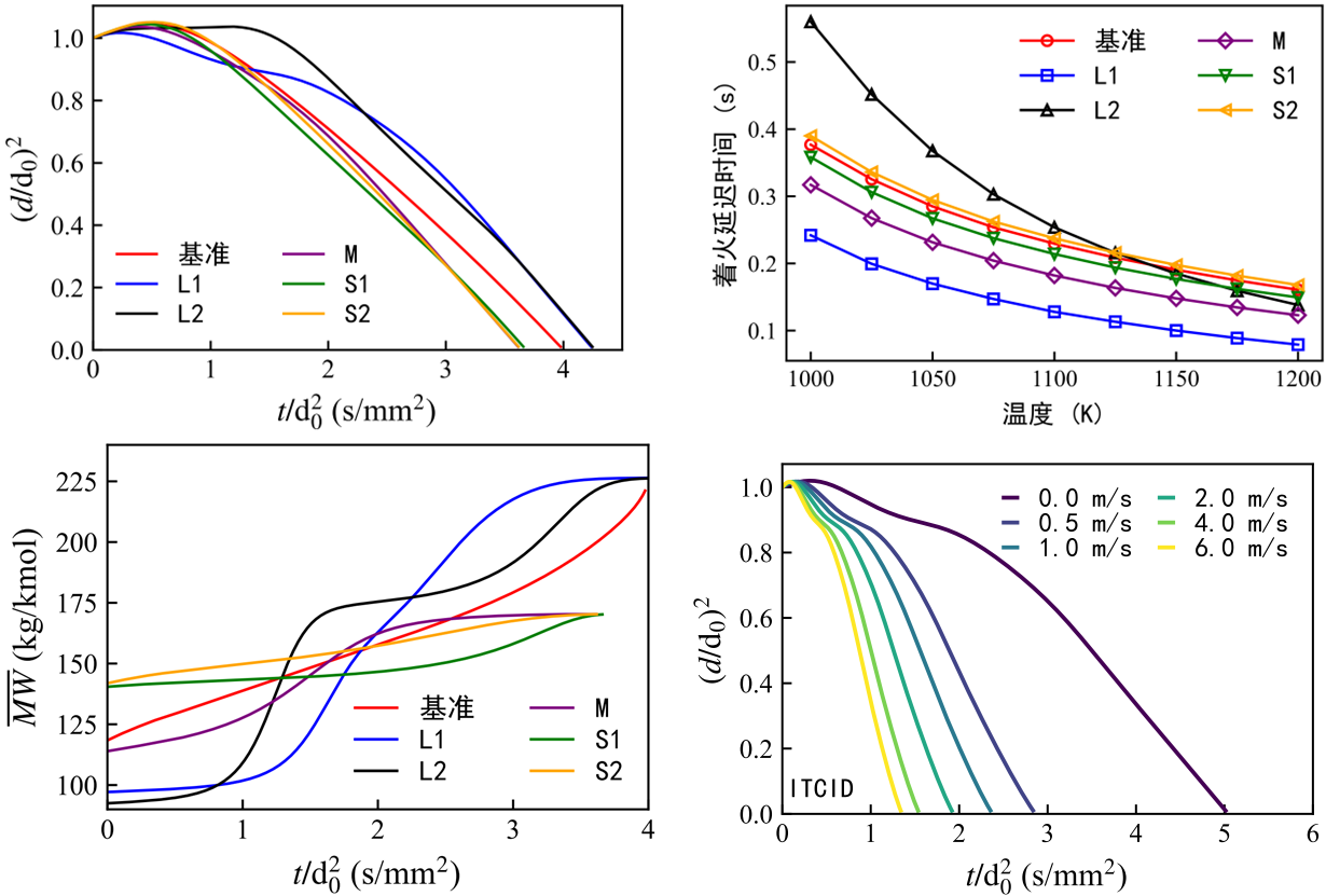 通过数值仿真,本工作揭示了少组分燃料模型(3-5组分)的局限性:即使在宏观平均性质上与真实燃料匹配,其简化的组分分布仍无法准确复现复杂的优先性蒸发过程。组分挥发性差异过大会导致“液滴蒸发接力中断”,使液滴蒸发特性严重偏离经典的d⟡律,进而影响液滴自着火预测;将这些少组分燃料模型应用于喷雾燃烧仿真中,将造成气相瞬态燃烧性质的失真。