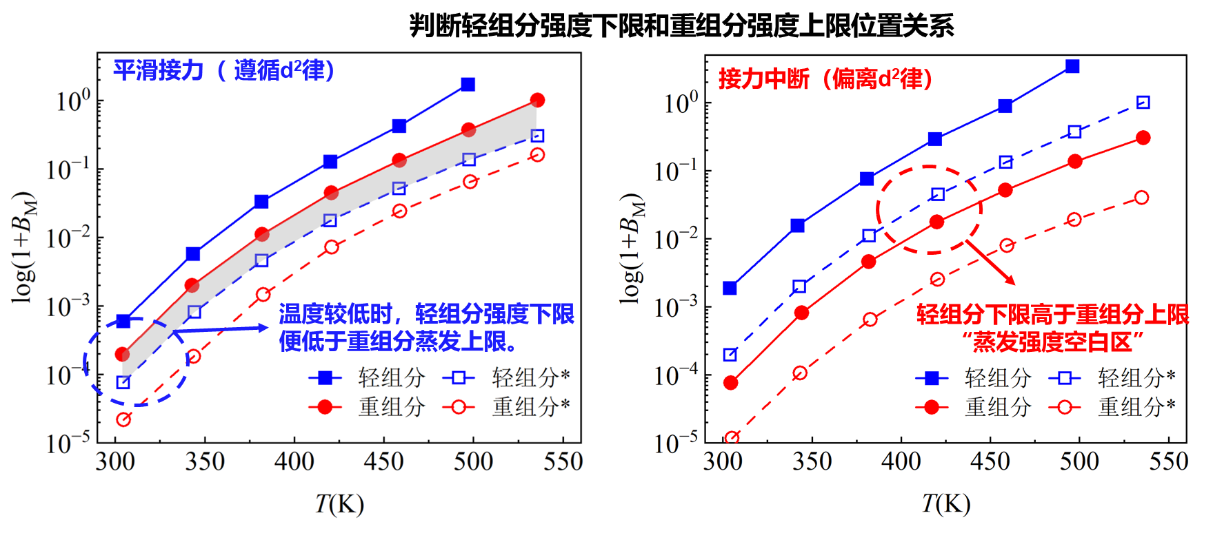 鉴于少组分燃料模型可能出现的“液滴蒸发接力中断”现象,本工作创新性提出了“组分蒸发强度图”燃料模型评估工具:从物理机制出发,通过量化轻重组分蒸发强度的衔接关系,先验地、快速地判断“液滴蒸发接力中断”是否发生,为燃料模型的开发筛选提供了直观依据。